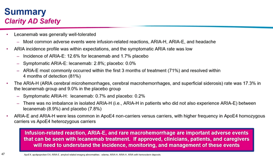 来自美国巴罗神经学研究所的MarwanSabbagh教授详细介绍了安全性方面数据,仑卡奈单抗治疗中最常见的不良事件是输液反应,仑卡奈单抗治疗组26.4%的患者出现轻度至中度的输液反应。临床上备受关注的淀粉样蛋白相关影像学异常-渗出/水肿(ARIA-E)在仑卡奈单抗治疗组发生率为12.6%,安慰剂组为1.7%。ARIA-出血(H)在仑卡奈单抗治疗组发生率为17.3%,安慰剂组为9.0%。在研究期间,仑卡奈单抗组和安慰剂组中患者死亡率分别为0.7%和0.8%。无药物治疗相关死亡(图6)。