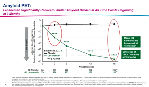 作为一种人源性抗Aβ原纤维的单克隆IgG1抗体,仑卡奈单抗可通过小胶质细胞靶向清除毒性Aβ聚集体如可溶性原纤维和寡聚体,延缓AD患者的神经退变和认知能力的下降。会议上公布了仑卡奈单抗治疗后降低脑脊液内Aβ水平的结果。18月时,Aβ降低了59.1 Centiloids。仑卡奈单抗治疗18个月后,平均淀粉样蛋白PET为22.99 Centiloids,低于淀粉样蛋白的阳性阈值(30Centiloids,图4)。