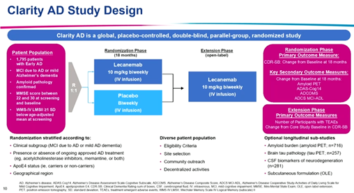 会议由来自东京大学的Takeshi Iwatsubo教授主持,卫材临床研究副总裁Michael Irizarry开场介绍了研究背景和设计。Clarity AD是一项为期18个月的全球、安慰剂、双盲、平行、对照、开放期延续的III期临床试验,旨在评估仑卡奈单抗治疗早期阿尔茨海默病(AD)患者的有效性和安全性。该研究共纳入1795例经Aß-PET或脑脊液确认脑内存在AD病理改变、MMSE评分22-30分的早期AD(包括AD源性的轻度认知功能障碍和轻度AD)患者,以1:1的比例随机接受仑卡奈单抗(10 mg/kg静脉注射,每两周一次)或安慰剂治疗(图1)。
