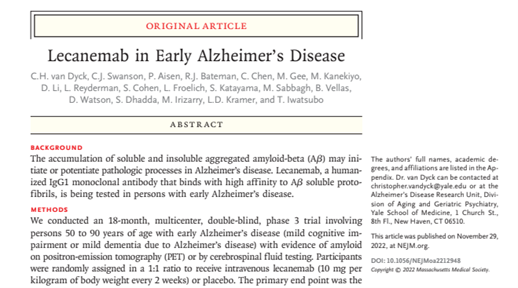 美国时间2022年11月29日-12月2日在旧金山举办的第15届阿尔茨海默病临床试验会议(CTAD)开幕首日,备受瞩目的淀粉样蛋白(Aβ)靶向治疗药物Lecanemab(仑卡奈单抗,BAN2401)研究团队报告了全球Clarity AD研究Ⅲ期临床结果。