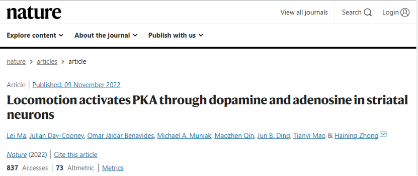 Ma, L., Day-Cooney, J., Benavides, O.J. et al. Locomotion activates PKA through dopamine and adenosine in striatal neurons. Nature (2022). https://doi.org/10.1038/s41586-022-05407-4