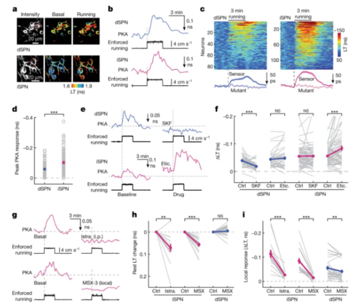 近日,《Nature》杂志发布了俄勒冈健康与科学大学(OHSU)钟海宁研究组的研究成果:“Locomotion activates PKA through dopamine and adenosine in striatal neurons”。他们实现了DLS SPN的在体PKA成像,首次发现运动时神经调质如何调控iSPN内PKA信号。明确无误地揭示了腺苷是与多巴胺在对立意义上起作用的神经递质,为药物开发提出新的途径。