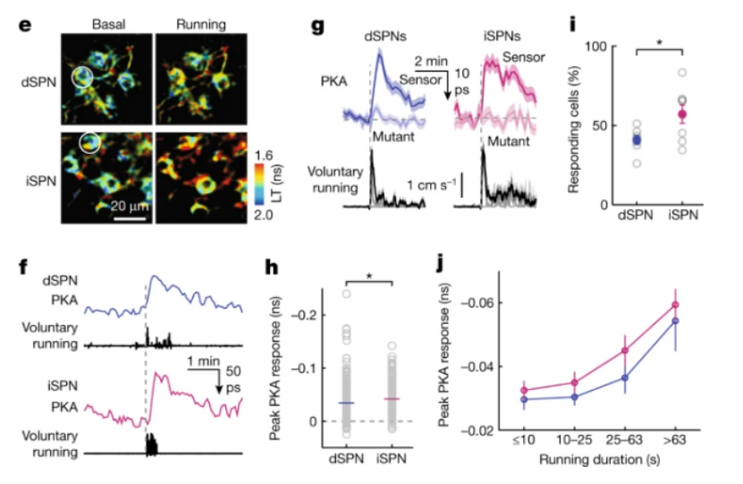 明确PKA对运动的重要性后,作者探究SPN胞内PKA水平如何受运动影响。他们发现,运动时dSPN与iSPN PKA活动水平明显提高,iSPN提高幅度更大;且随着运动时程的延长,dSPN与iSPN PKA活性升高越显著。