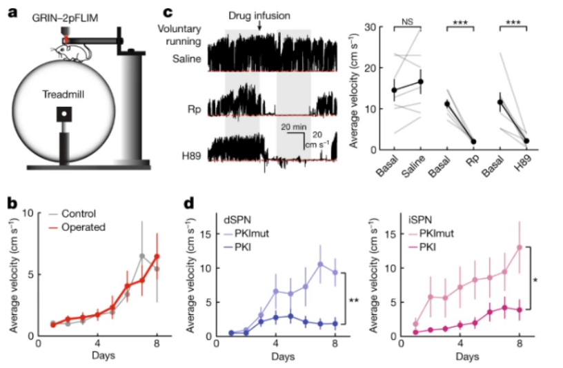 为进一步探究运动与两类SPN内PKA活动之间的关系,作者结合了2pFLIM与treadmill locomotion范式。首先测试动物运动是否受到PKA活动操纵的影响,分别给予小鼠两类不同的PKA活性拮抗剂——Rp-8-Br-cAMPs或H89,发现小鼠运动水平降低80%,提示DLS的PKA活动影响运动。之后作者分别在dSPN或iSPN内特异性表达PKl(一种PKA抑制性蛋白;通过8个注射位点保证DLS充分表达PKl),发现小鼠运动水平显著降低,提示iSPN和dSPN中PKA均对正常运动是必要的。