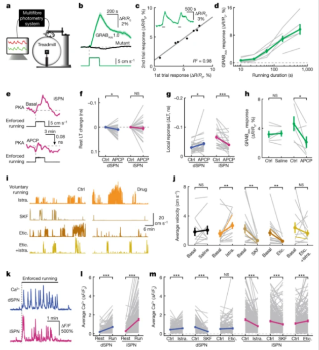 那么,按照研究套路,明确了腺苷激活基础下的和运动下的iSPN PKA水平,那DLS腺苷的释放水平如何受运动影响呢?