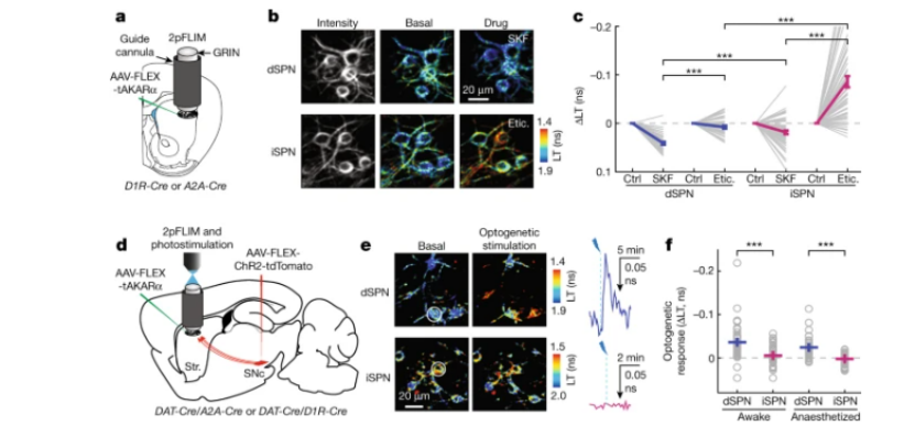 作者在D1R-Cre或Adora2a-cre小鼠的DLS注射了腺相关病毒(AAV)(一种PKA探针),植入GRIN lens,加上双光子荧光寿命显微成像(2pFLIM)技术手段,首次实现dSPN或iSPN的PKA在体成像,成功发现基础条件下SPN中存在PKA活性。