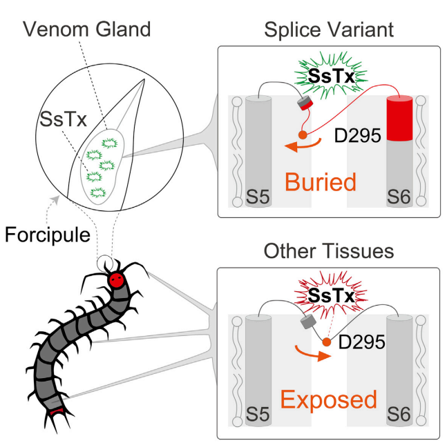 在蜈蚣毒腺组织特异性的可变剪切可以使自身受体的突变只发生在毒腺中,而其他不接触毒素的器官则不需要突变,该策略极大降低了完成毒素自我耐受所需承担的功能代价。