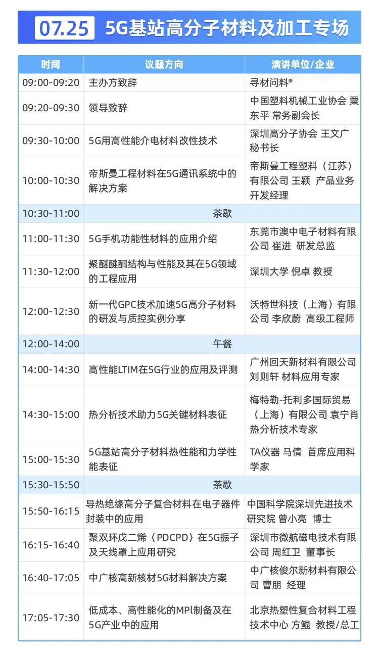 主办,中国通信工业协会、新材料在线®、深圳5G产业联盟、深圳先进电子材料国际创新研究院、宝安区5G产业技术与应用创新联盟、测了么协办。活动的顺利举办要感谢华夏幸福基业股份有限公司 、东莞中集创新产业园发展有限公司、河北镁神科技股份有限公司、河南天马新材料股份有限公司、深圳善时仪器有限公司、东莞市澳中电子材料有限公司、沃特世科技(上海)有限公司、美国TA仪器、回天胶业集团 、中国塑料机械工业协会、广东省塑胶行业协会、深圳高分子行业协会、中国电子科技集团公司第十三研究所、中国科学院深圳先进技术研究院、北京中科纳通电子技术有限公司、中南大学粉末冶金研究院、深圳大学、中国移动、帝斯曼工程塑料(江苏)有限公司、中广核俊尔新材料有限公司、北京纳盛通(NST)新材料科技有限公司、东莞市拓福德涂装设备有限公司、深圳市微航磁电技术有限公司、泰格尔科技有限公司、SGS通标标准技术服务有限公司、中数经纬、模切之家、掌工知、采购界等单位的大力支持。