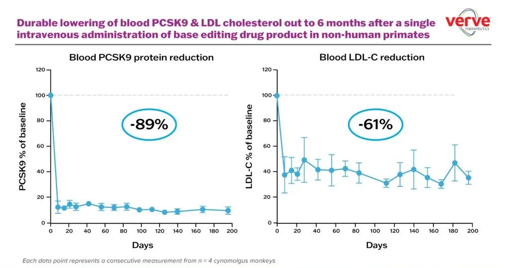 前期非人灵长类动物实验已经证明了编号为 VERVE-101 的 LNP 递送碱基编辑抑制 PCSK9 的疗效和持久性。
