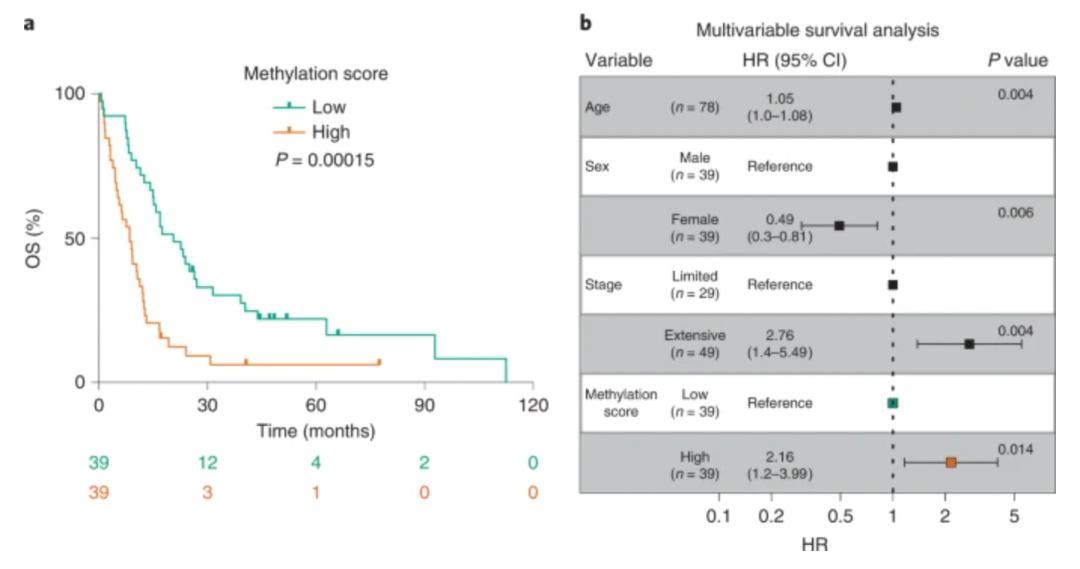 这些数据表明 cfDNA 甲基化分析在 SCLC 中具有潜在的临床效用,以及对SCLC患者生存期的准确判断。