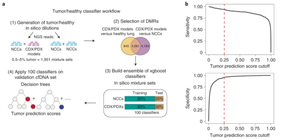 通过重复训练过程100次构建集成分类器,每次使用 80% 的样本,敏感性和特异性分析确定了一个最佳截止值,用于敏感肿瘤检测的 DNA 甲基化分类器的生成。
