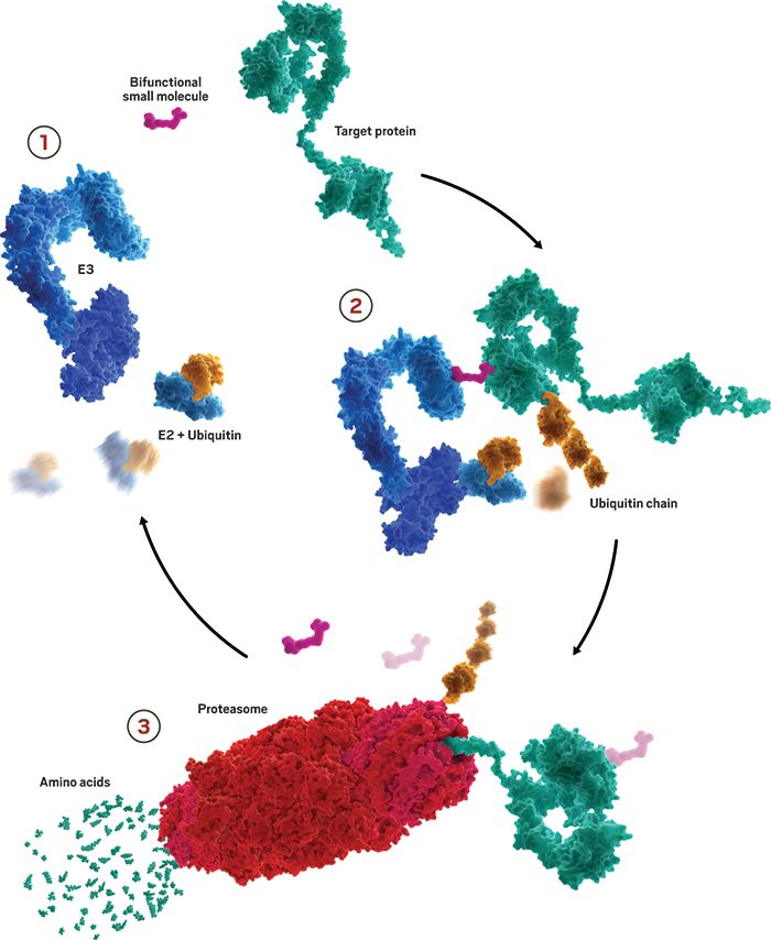 蛋白降解疗法的原理是基于细胞里的“垃圾处理站”——泛素-蛋白酶体系统(ubiquitin-proteasome system, UPS)。该疗法的设计理念是:通过一种像“双面胶”似的具有两个活性端的小分子,一端与靶标蛋白相结合,另一端与E3泛素连接酶相结合。通过此靶标蛋白会被泛素化,然后被运送到细胞的“垃圾处理站”蛋白酶体中被降解掉。