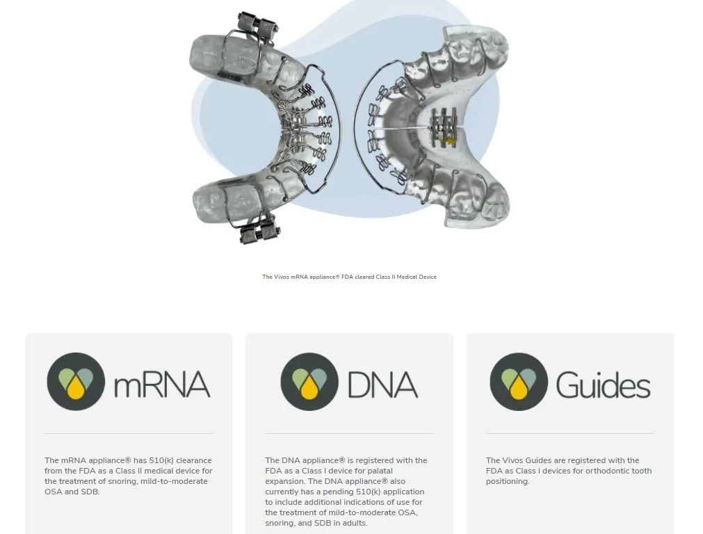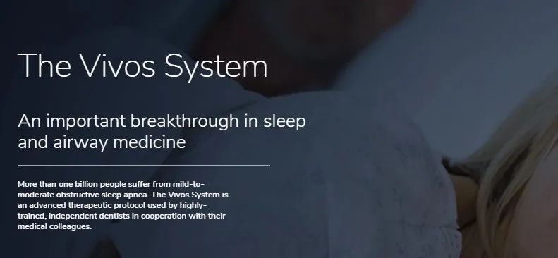 结合改变构成患者上呼吸道的组织的大小、形状和位置的专有技术和协议,Vivos系统打开气道空间,并可显著减少与轻度至中度OSA相关的症状和条件,如降低呼吸暂停低通气指数评分。Vivos还通过SleepImage诊断技术销售和分销VivosCore,用于成人和儿童的家庭睡眠测试。Vivos综合实践(VIP)计划提供牙医培训和其他与使用Vivos系统相关的增值服务。