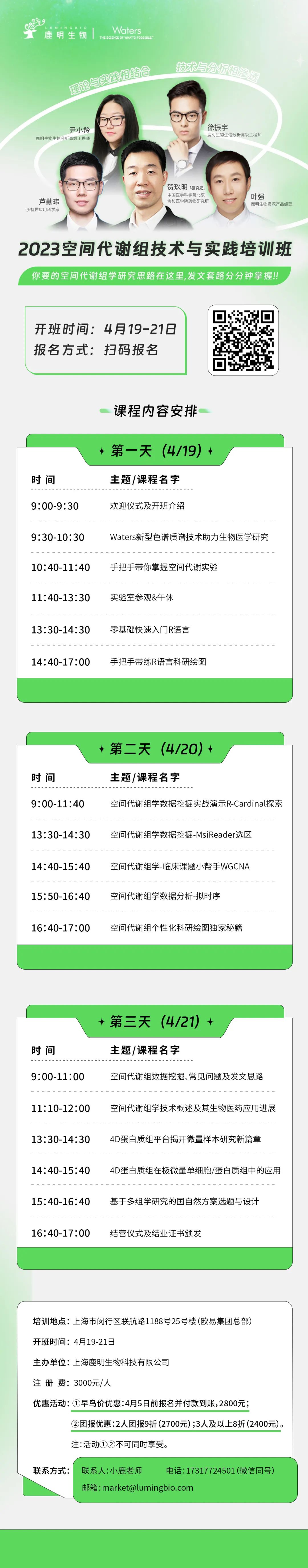 上海鹿明生物以其在组学培训班方面积累的丰富经验,从2009年开始陆续举办了各种系列的组学培训班,目前,即将迎来第35期空间代谢组学培训班!经过多年的空间代谢组学探索,鹿明生物在空间代谢组技术方面也积累了丰富的经验,已落地执行200多个空间代谢组项目!该培训班注重理论与实践相结合,手把手指导空间代谢组实验操作、传授空间代谢组个性化科研绘图独家秘籍、深度挖掘空间代谢组数据并整理分析思路等。如果您想要学习空间代谢组技术,鹿明生物第35期空间代谢组培训班「尽快来学」吧!
