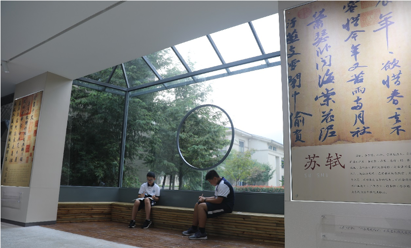 校内,连接各教学区和生活区的风雨长廊,不仅为学生遮风避雨,更让学生在日常行走间接受艺术的熏陶,感受科学的魅力。