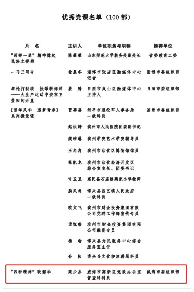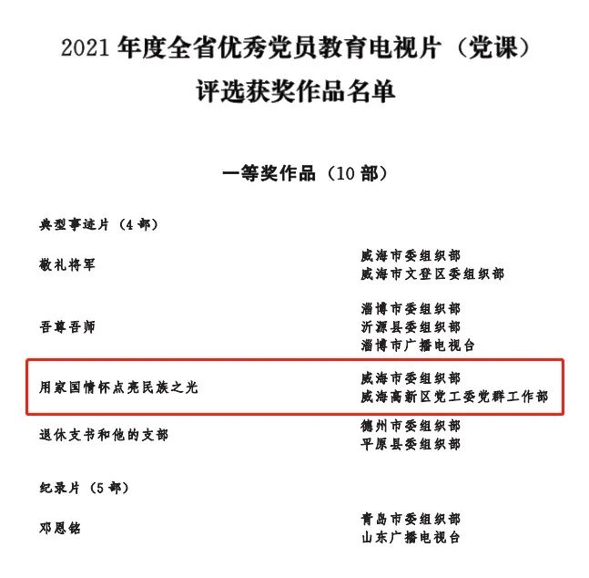 为表彰先进、推动工作,省委组织部组织开展了2021年度全省优秀党员教育电视片(党课)评选工作。经初审把关、专家评审和观摩互评,共评选出100部获奖电视片、100部优秀党课。其中,我区报送的光威集团创始人陈光威典型事迹片《用家国情怀点亮民族之光》荣获全省一等奖,《“四种精神”映韶华》被评为全省100部优秀党课。