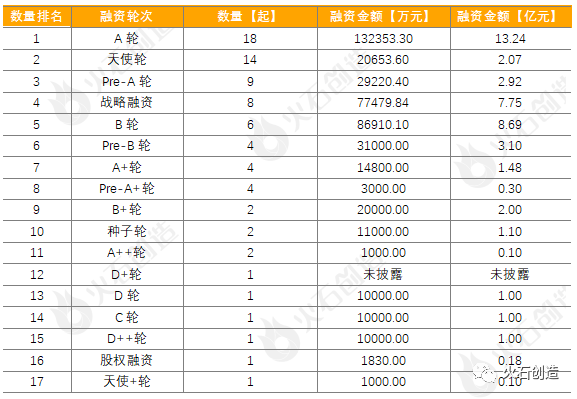 从融资数量来看,以A轮和天使轮发生的融资事件最多,分别为18起和14起。从融资金额来看,A轮融资获得最高融资金额13.24亿元;其次,B轮融资金额也较为突出,融资金额达8.69亿元。