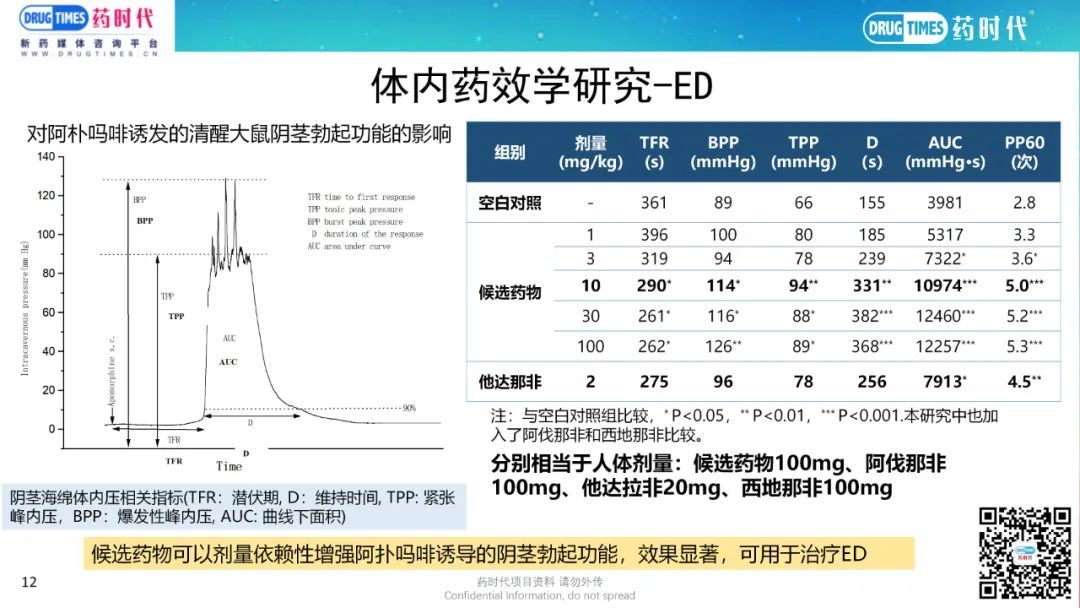 药时代此次推荐的项目为一款高选择性、长半衰期的PDE-5小分子抑制剂,根据已开展的临床及非临床研究结果,该候选药物药代性质良好,安全性优异,有望成为Best-In-Class的药物。目前处于临床II期,化合物专利在中美日欧多地获得授权,预计2033年到期。