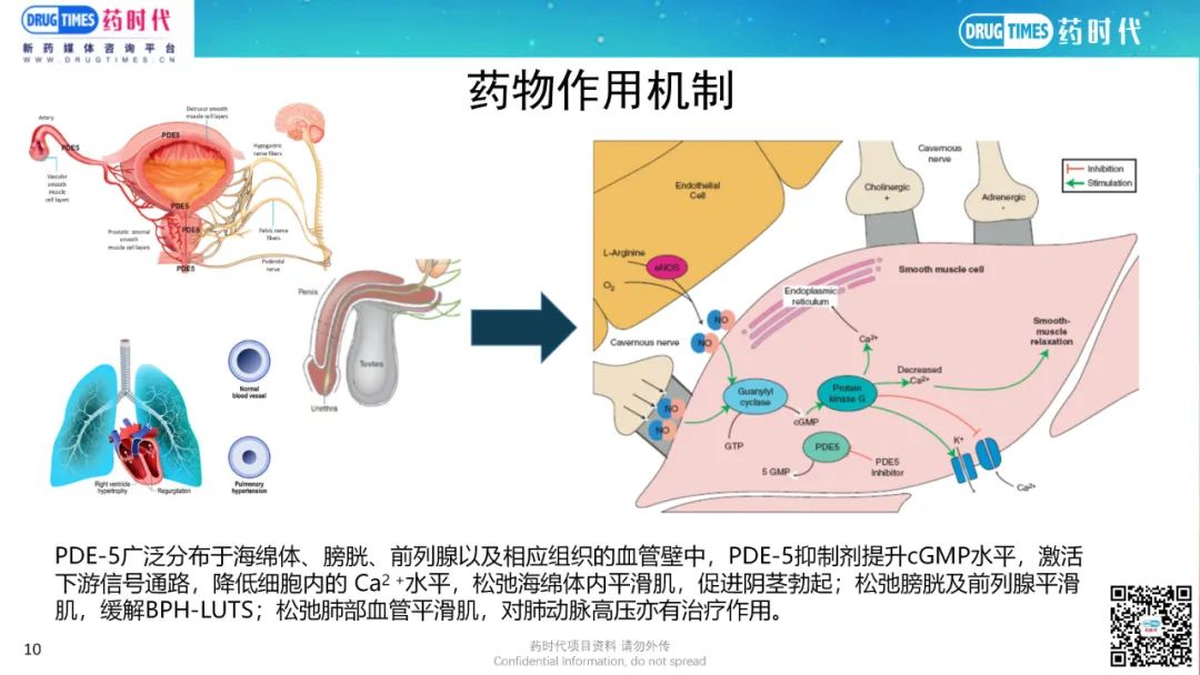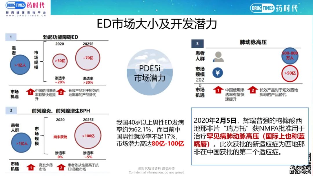 据了解,目前PDE家族共有11个成员,其中以PDE5最为有名。第一款PDE5抑制剂是西地那非(中国俗名“伟哥”),在1998年于美国上市,2000年进入中国。PDE-5广泛分布于海绵体、膀胱、前列腺以及相应组织的血管壁中。PDE-5抑制剂通过提升cGMP水平,激活下游信号通路,降低细胞内的 Ca2 +水平,从而松弛海绵体内平滑肌,促进阴茎勃起。后面研究发现,PDE-5抑制剂也可以通过松弛肺部血管平滑肌治疗肺动脉高压(PAH),通过松弛膀胱及前列腺平滑肌缓解良性前列腺增生引起的下尿路症状(BPH-LUTS)。据了解,我国40岁以上男性ED发病率约为62.1%,就诊率不足17%。市场潜力高达80~100亿。我国肺动脉高压患者有500~800万人,市场规模大于50亿元。