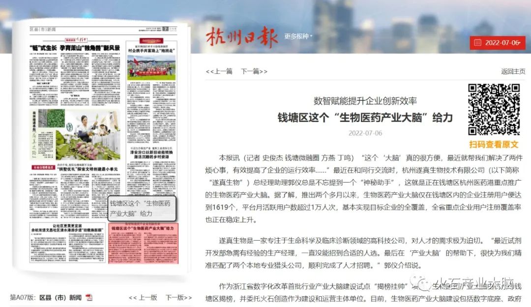 此前,浙江日报6月13日专版刊发《钱塘区:以数字之力 激发高质量发展澎湃动能》。并在勇当“探路者” 国家级省级试点取得新突破板块之下重点介绍“生物医药产业大脑”。