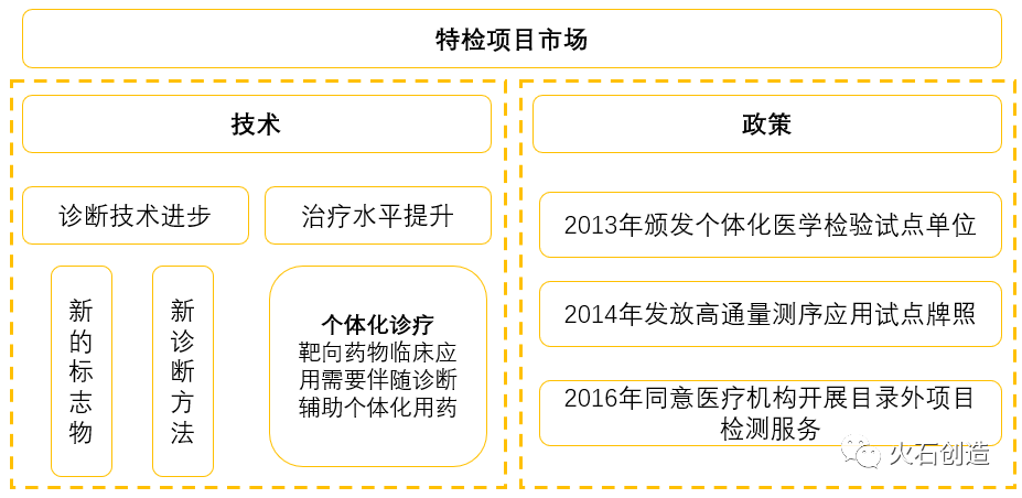 国内的医学实验室可分为规模化的普检实验室和专业化的特检实验室。规模化的普检实验室仅提供原卫计委发布的《医疗机构临床检验项目目录》中包括的1462个临床检验项目(表内项目),而特检实验室指的是检测不包括在该目录中的项目(表外项目或是特检项目)。其中特检项目由于检测频率较低,检验方法复杂,需要更加专业的技术人员和仪器设备,因此在医院的检验科室一般很少开展,基本上都依赖于特检实验室。