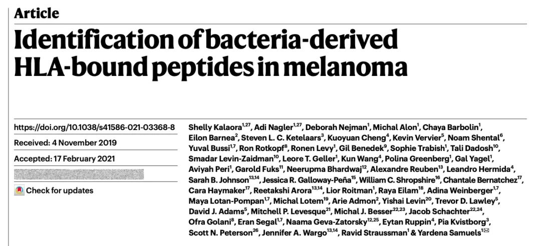 Nature | 黑色素瘤中鉴定到细菌抗原肽,为细菌影响免疫系统活化和抗肿瘤治疗反应提供新机制