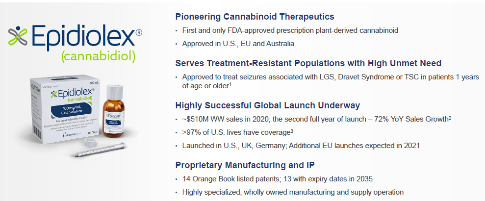 Epidiolex上市两年,2020年销售额即达到5.1亿美元,很快将成为重磅炸弹级别药物。