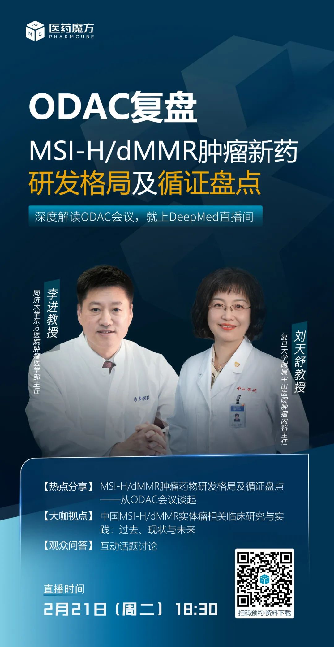 医药魔方DeepMed医学数据团队跟踪分析大量循证研究数据,旨在帮助企业和研究者及时了解国际创新药最新动向和趋势,助力中国创新药临床研究及实践的创新与变革。以此次ODAC会议为契机,医药魔方DeepMed数据库拟于2月21日(周二)举办主题为《ODAC复盘:MSI-H/dMMR肿瘤药物研发与临床实践》的线上直播分享。届时,同济大学附属东方医院肿瘤医学部主任李进教授和复旦大学附属中山医院肿瘤内科主任刘天舒教授将做客“DeepMed直播间”,共同探讨dMMR/MSI-H肿瘤药物研发格局,并探讨我国该领域的临床实践和临床研究现状及展望。