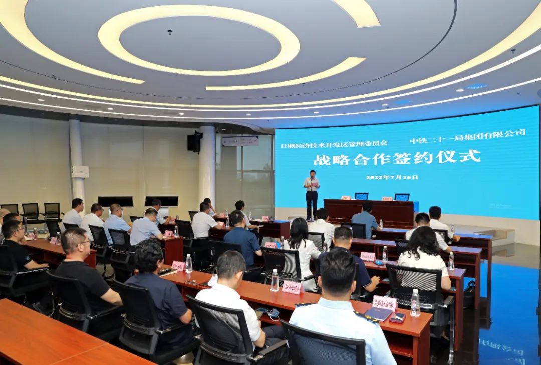 7月26日,日照经开区与中铁二十一局集团有限公司签署战略合作协议。中铁二十一局集团有限公司党委书记、董事长庄纪栋,区工委书记、管委主任孙立出席活动并致辞。区工委委员、管委副主任古茂林与企业负责人签约,区领导夏永、宋瑞军参加活动。