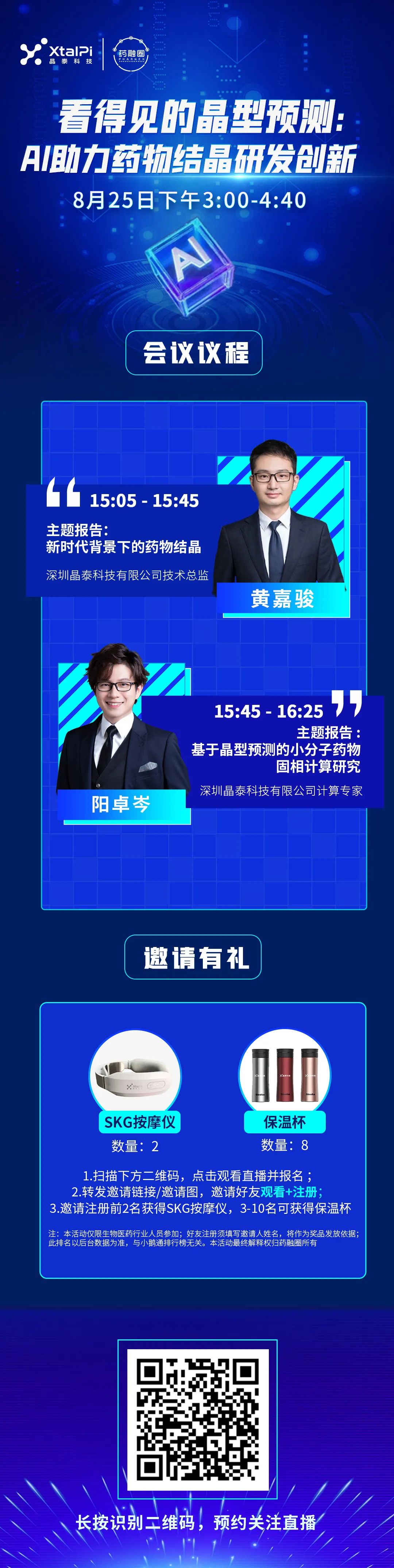 实际上,晶型预测已经是非常成熟的计算平台,晶泰科技已经服务了众多国内外药企客户并取得了显著成果。为让业界同行更进一步了解晶型预测及固研新技术,药融圈联合晶泰科技,于8月25日下午3:00-4:40举办本次会议,邀请晶泰科技技术总监黄嘉骏与晶泰科技计算专家阳卓岑,以“看得见的晶型预测:AI助力药物结晶研发创新”为主题,安排了计算专家进行软件平台的可视化展示操作,带大家更深入地了解这项技术。