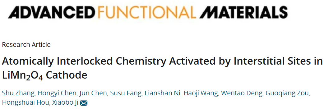 近日,相关论文以《在 LiMn2O4 阴极中由间质位点激活的原子互锁化学》(Atomically Interlocked Chemistry Activated by Interstitial Sites in LiMn2O4 Cathode)为题发在 Advanced Functional Materials 上,张舒是第一作者,纪效波担任通讯作者[1]。