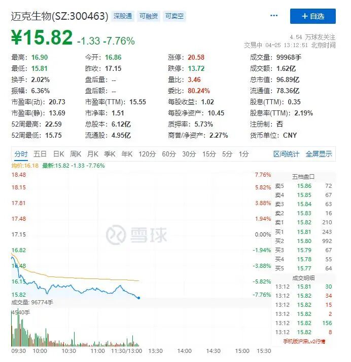 受到年报发布影响,4月25日,迈克生物股价暴跌,截止发稿时,暴跌7.76%。