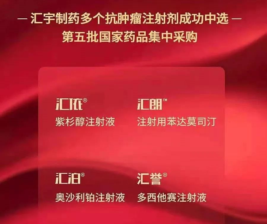 此外,四川汇宇 4 个品种也全部中选,分别为注射用盐酸苯达莫司汀、紫杉醇注射剂、多西他赛注射剂、奥沙利铂注射剂。