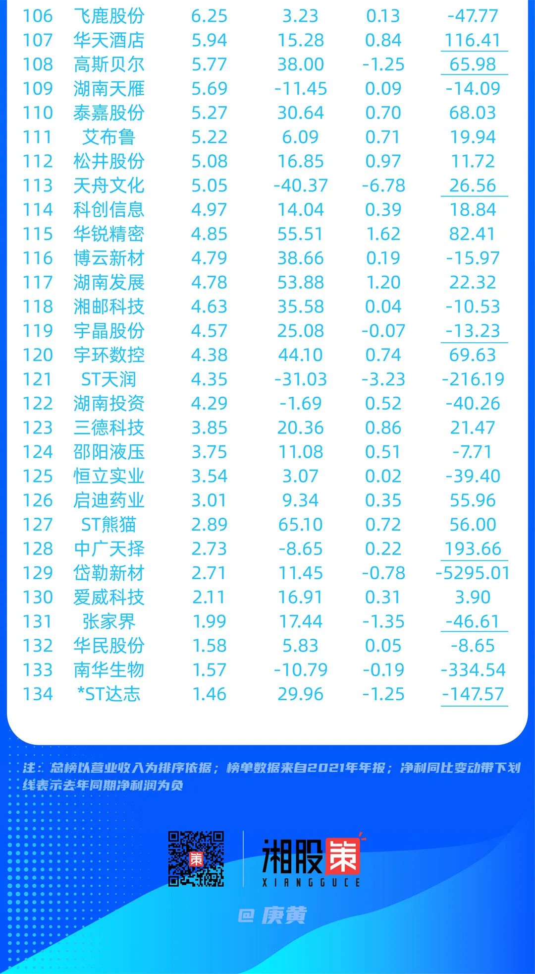 134家持有“湘A”牌照的上市公司共实现营业收入约8097亿元,净利润合计约542亿元。香菇君统计发现,110家公司实现营收正向增长;79家实现净利润正向增长,其中4家逆袭成功,实现扭亏为盈。