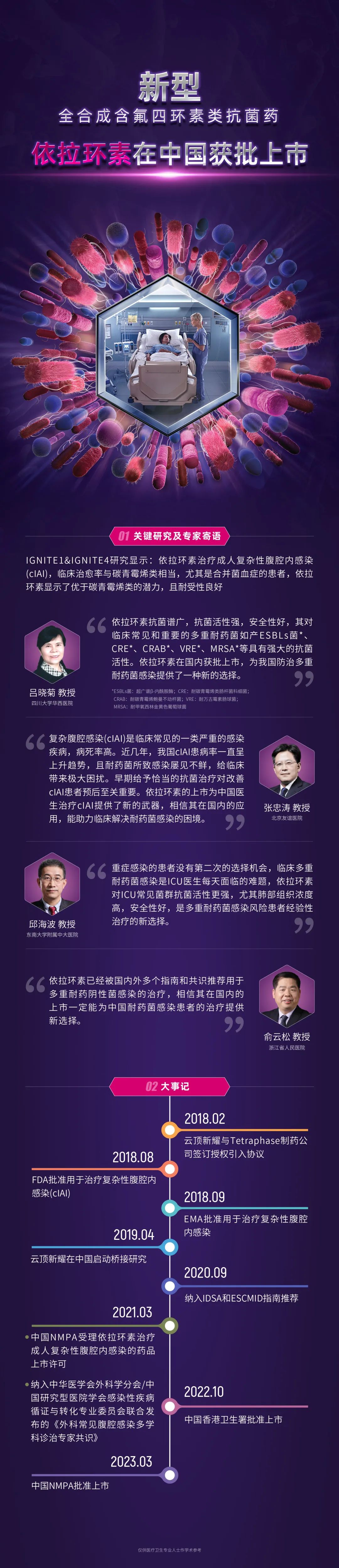 依拉环素已被美国传染病学会(IDSA),欧洲临床微生物学和传染病学会(ESCMID)等多个国内外权威指南推荐用于包括碳青霉烯类耐药在内的多重耐药菌感染的治疗方案。
