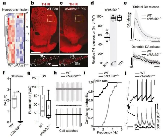 为了证明MCI功能障碍是否作为PD的驱动因素,该团队从小鼠多巴胺能神经元中特异性地敲除编码MCI催化核心亚基的Ndufs2基因。研究人员发现,敲除NDUFS2的小鼠线粒体功能出现障碍,在接下来的几个月内小鼠出现了一系列神经退行性症状。刚开始,纹状体轴突释放的多巴胺丢失,黑质中的树突结构和释放的多巴胺减少;接着神经元的轴突出现退化;4-5个月后,多巴胺能神经元死亡。在PD患者出现运动症状之前,脑内也会发生类似的上述变化。