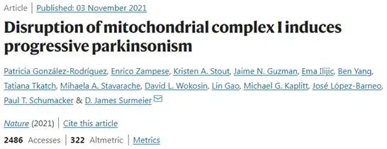2、Patricia González-Rodríguez et al. Disruption of mitochondrial complex I induces progressive parkinsonism. Nature, 2021, doi:10.1038/s41586-021-04059-0.