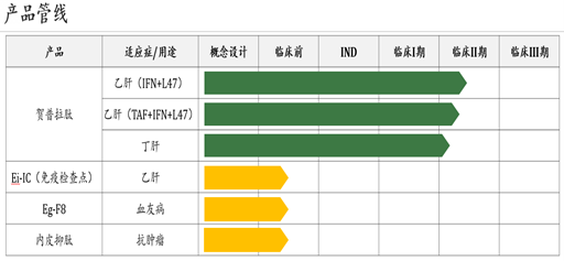 贺普药业长期专注病毒性肝炎领域创新药物研发,其研发的乙肝/丁肝病毒进入阻断新药贺普拉肽(hepalatide)目前处于Ⅱ期临床研究阶段。贺普药业与吉利德是目前全球仅有两家研发乙肝/丁肝病毒进入阻断多肽的公司。吉利德研发的bulevirtide于2020年被欧盟有条件批准用于丁肝治疗,近日刚刚宣布bulevirtide的Ⅲ期临床研究获得成功,2mg和10mg剂量治疗丁肝48周分别获得45%和48%生化和病毒学综合应答率,对照组应答率仅为2%。目前吉利德已经向美国FDA提交了上市申请。贺普药业研发的hepalatide目前正在进行与干扰素联合治疗乙肝的Ⅱ期临床研究,初步结果显示其治疗的临床有效性理想,即将开展治疗丁肝的Ⅱ期临床研究。