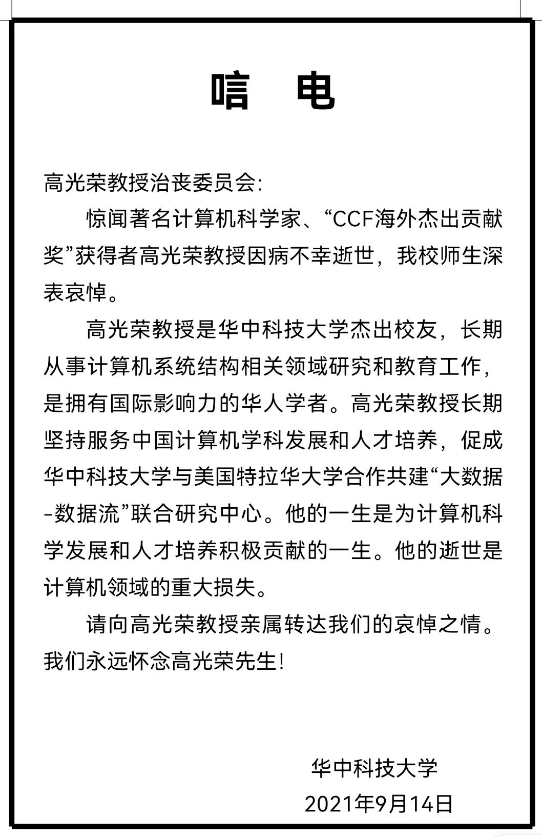 华中科技大学也发来唁电,深切缅怀这位杰出校友。