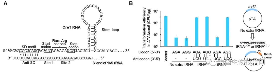 对CreT RNA的精细序列和结构分析表明,其5'端具有强效的翻译信号SD(Shine-Dalgarno)序列和AUG起始密码,紧接其后的是两个精氨酸稀有密码子AGA, 随后是终止密码子UGA和一个茎环结构(图3A)。系列突变实验表明,上述关键序列和结构都是CreT毒性所必需。基于此,该团队推断了一个全新的分子回路,即CreT RNA借助强效的翻译起始信号定位在核糖体上,然后通过两个串联的稀有密码子AGA进一步劫持胞内稀有的精氨酸tRNAUCU,从而抑制了胞内其它重要蛋白的翻译合成和细胞生长。基于这一猜想,他们通过过表达tRNAUCU成功解除了CreT的细胞毒性(图3B),证实了这一全新的毒性机制,即CreT 是通过其RNA劫持胞内稀有的精氨酸tRNA发挥毒性,而非翻译产生含二精氨酸的小肽发挥作用,因此CreT是一类小RNA毒素。