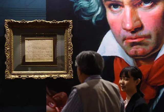 2016年5月12日,在北京举行的嘉德2016春季拍卖会现场,观众在欣赏贝多芬的《庄严弥撒》创作手稿。新华社记者罗晓光摄