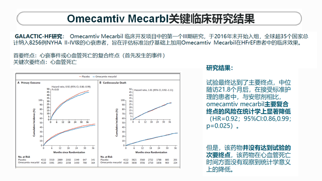 心衰领域的疾病情况是这样的:流行病学方面,慢性左心衰患病率为1.5%~2.0%,≥70岁人群患病率≥10%,心衰患病率呈不断上升的趋势。心衰是各种心脏疾病的严重表现或晚期阶段,死亡率和再住院率居高不下,在中国,住院心衰患者的病死率为4.1%。58.9%患者会在出院后2周内再次入院, 12.5%的心衰住院患者会在出院后30天内再次入院。心衰存在很大的未满足的临床需求:目前药物仅改善患者症状,对心脏损伤无明显改善,无法控制病情进展。对于终末期心衰患者,心脏移植是目前唯一有希望的治疗选择,而中国目前至少有10万例心衰患者急需心脏移植,但每年开展的心脏移植手术仅几百例。标准治疗是肾素血管紧张素系统抑制剂ACEI/ARB,Beta blocker和醛固酮受体拮抗剂是治疗慢性心衰的金三角。近几年获批的产品包括脑啡肽酶/ACE抑制剂;SGLT-2抑制剂;可溶性鸟苷酸环化酶激动剂。可以看到,药物研发或BD这个心衰的领域是有充分的理由的。OM的CDP,有11个1期临床研究,300例受试者,对PK/PD 特征探索得比较充分,7个2期临床研究,1400个受试者,对剂量进行探索。另外还有两个大样本量的III期临床研究,GALACTIC-HF研究以及METEORIC-HF研究。GALACTIC-HF研究是OM临床开发项目中的第一个III期研究,2016年末开始入组,全球超35个国家总计纳入8256例NYHA II-IV级的心衰患者,目的是评估标准治疗基础上加用OM在射血分数降低的心衰患者中的临床效果。首要终点是心衰事件或心血管死亡的复合终点(首先发生的事件)。关键次要终点是心血管死亡。试验达到了主要终点。中位随访21.8个月后,在接受标准护理的患者中,与安慰剂相比,OM在主要复合终点的风险在统计学上显著降低(HR=0.92;p=0.025)。正常情况下,达到临床试验的主要疗效终点就被认为是一个胜利。但是,该药物并没有达到试验的次要终点,在心血管死亡时间方面没有观察到统计学意义上的降低。