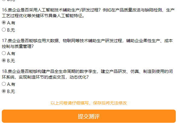 用户根据填报的企业类型,会出现相对应的的问卷,填写完毕后,点击“提交测评”,如图 5所示,即可完成测评。