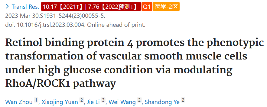 Wan Zhou et al. Retinol binding protein 4 promotes the phenotypic transformation of vascular smooth muscle cells under high glucose condition via modulating RhoA/ROCK1 pathway. Transl Res. 2023 Mar 30;S1931-5244(23)00055-5. doi: 10.1016/j.trsl.2023.03.004.