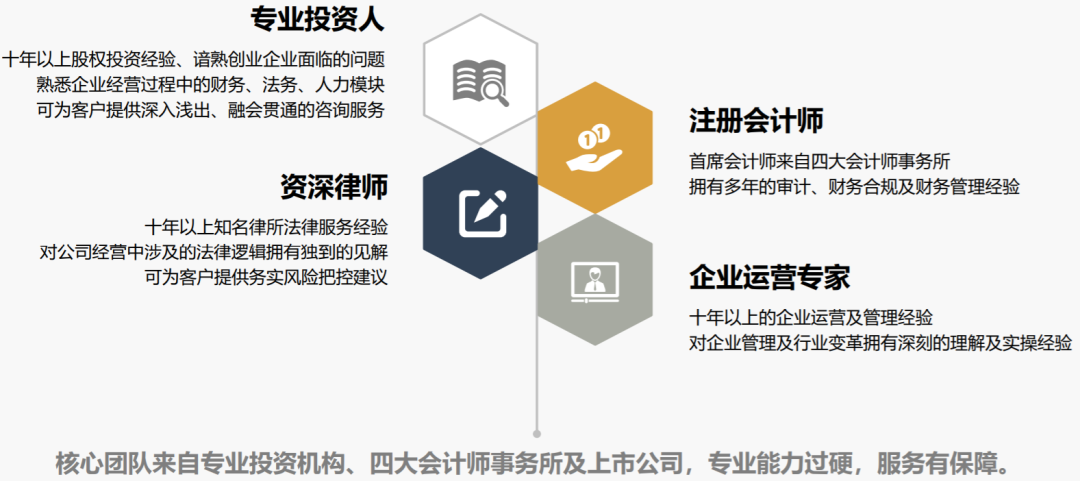 核心团队由上市公司及投资机构的专业投资人、四大会计师事务所的注册会计师及资深律师组成,在专业能力、需求理解、实操经验及服务效率方面均有着市场无可比拟的优势。