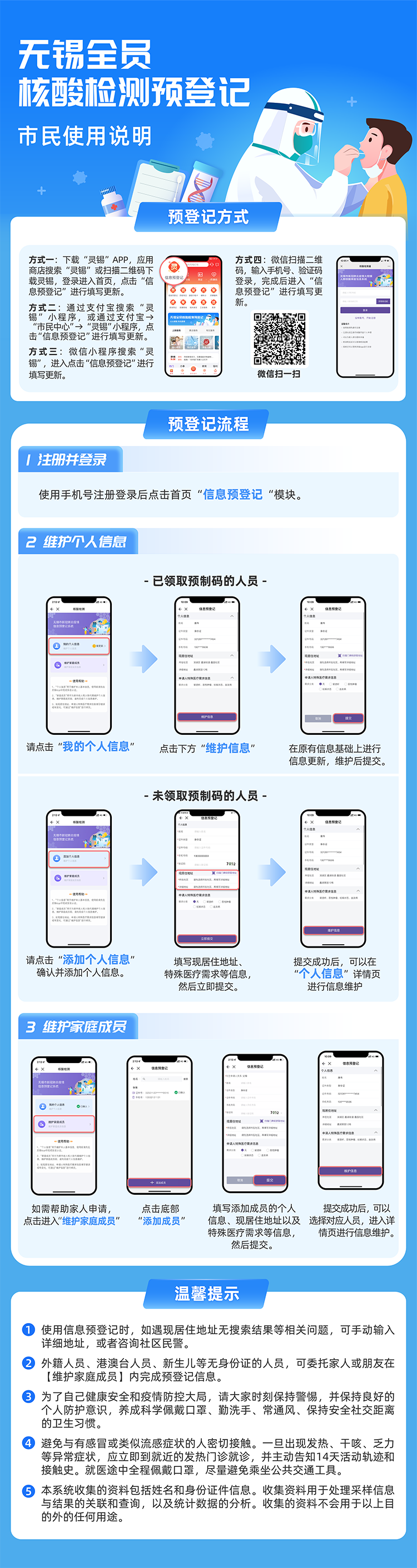 关于开展 全员核酸检测预登记的通告 为进一步做好新冠肺炎疫情防控工作,保证新冠疫情防控需要时能够有序高效开展全员核酸检测,并满足应急状态下居民生活物资保障和特殊医疗服务需求,我市决定于 1月27日0时至24时 组织 全员核酸检测预登记 。请广大居民 及时有序分批次 参加预登记工作。用户预登记时请扫描下方二维码, 下载灵锡APP (已下载用户直接登录灵锡)或使用 微信、支付宝灵锡小程序, 填报身份信息、联系方式、实际居住地址和特殊医疗服务需求,原有信息如有变动请修改更新; 没有智能手机或不会上网的市民请在家人或社区工作人员的帮助下 进行信息预登记。 疫情防控,人人有责,让我们共同守护暨阳平安。感谢市民朋友的理解和配合。 ▲扫码下载灵锡APP ▲微信、支付宝扫码登录 江阴市新型冠状病毒感染的肺炎 疫情防控应急指挥部 2022年1月25日 -------- 来源:江阴发布 审核:夏凯、俞静 编辑、发布:薛琳 END