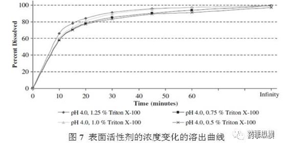 表面活性剂种类和浓度都需要进行筛选。同样是《看明白新药如何开发溶出方法,才能做好仿制药》中提到了:在不同pH介质中加入SLS,会导致达沙替尼相变,最终形成一种粘性的非晶相。这说明SLS不合适。筛选其他几个非离子型表面活性剂包括泊洛沙姆、溴化十六烷基三甲基铵、TritonX-100。最终选择TritonX-100,因为其使用方便,易于获得。因此表面活性种类需要进行筛选。而在确认使用TritonX-100后,其浓度耐用性同样进行验证:体积比分别为0.5%、0.75、1.25%。图7表明使用0.75、1.25%,与1%的溶出曲线的相比,计算f2因子,分别为72、68,表明在±0.25%范围内,耐用性良好。表面活性剂±2.5mL/L是可以接受的。