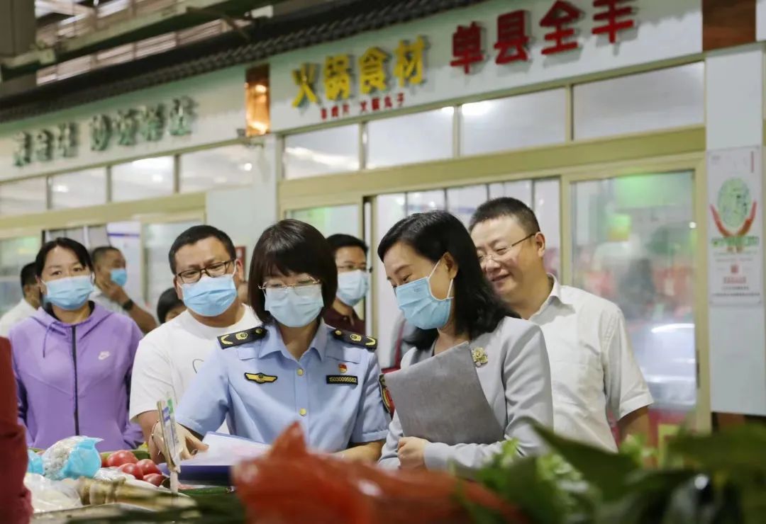 随后调研组来到南营农贸市场,调研市场食品快检、“你点我检”活动开展情况。调研组一行随机抽查了经营业户肉品品质检验合格证、动物检疫合格证明等,并走进快检室,查看在用检测设备,翻看各类食品快检记录及不合格食品处置记录,听取了市场主办方关于检测样品采集种类、检测频次、检验结果报送、不合格食品处置、快检信息公示等情况介绍。