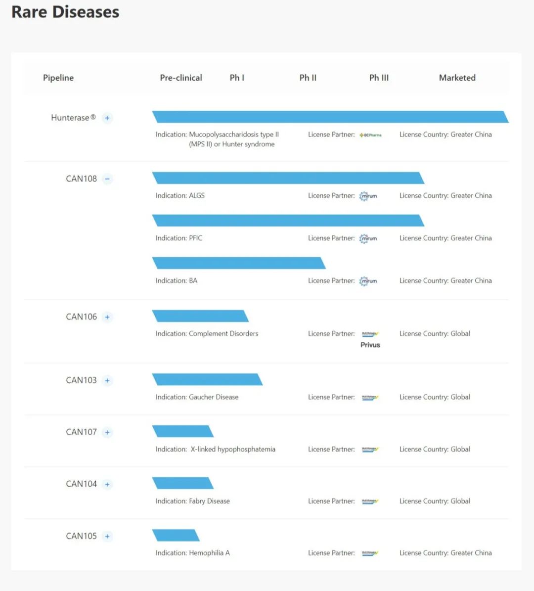 北海康成制药有限公司是一家创新生物制药公司,致力于在中国和全球加速推进罕见病和罕见肿瘤创新疗法的开发和商业化进程,以填补尚未满足的医疗需求。2021 年 12 月 10 日,北海康成在港交所上市。目前其管线中共有 11 款罕见病药物,涵盖罕见癌症、罕见病和基因疗法,其中引进自韩国 GC Pharma 的 Hunterase®(艾度硫酸酯酶β)已于 2020 年 9 月在中国获批。此外,北海康成还与药明生物建立了全球合作伙伴关系,共同开发和商业化治疗罕见遗传病的专利疗法。