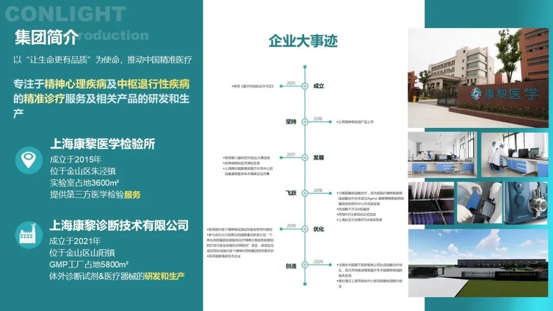 上海康黎医疗集团成立于2014年,是国内最早开展精神与神经系统疾病领域内药物基因组学检测业务的企业,现已是精神与神经系统疾病领域内检测和创新的领军企业,集团拥有300余人的高水平的人才队伍,恪守国际质量监管标准,注重环保、健康和安全。康黎集团专注于推动精神和神经系统领域、传染病诊断领域的先进临床技术和科学研究的持续进步。